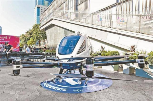 华强北曼哈广场展区中央,一台eVTOL(电动垂直起降飞行器)无人机伫立其间 图源:深圳特区报