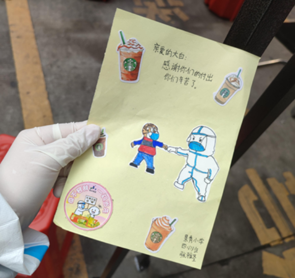3月20日下午,邓惠兮同志又出现在了福田区莲花街道梅富社区的一个核酸检测点,参与核验扫管的志愿服务,她要在当天完成核酸检测点500-600人次和扫码登记。突然,一位跟着妈妈排队做核酸的小女孩给邓惠兮递上一张“爱心卡片”。卡片中间贴的是小女孩手绘的“大白”与戴着口罩的小老虎“碰拳头”互相加油,四角贴上几杯“饮料”,猜测为“大白们辛苦了,请你们喝饮料”之意。上面几行稚嫩的字迹“亲爱的大白:感谢你们的付出,你们辛苦了。”右下角落款“景秀小学四(6)班张雅荃”。邓惠兮惊喜地收下卡片,告诉小朋友这次轮到她来当核酸小队长。小女孩特别兴奋,排队时蹦蹦跳跳,也主动张大嘴巴,配合医护人员做完核酸采样。“看到小朋友送的贺卡,内心暖暖的,感觉自己的辛苦非常值得!”邓惠兮不好意思地说。